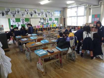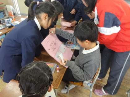 この“寄せ書き”は、毎年“ありがとう集会”の時に在校生から6年生に渡すもので、1年生〜5年生だけが作りました。6年生はこの時間図書室で別の活動をしていました。