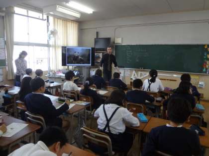 動物の絵と“大きい”“重い”“かわいい”などを英語でワークシートに書きました。