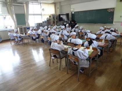 6年生に手伝ってもらって配膳も整い、静かに給食を食べていました。