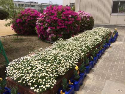4月17日(火) ツツジとノースポールのコントラストがとてもきれいです。