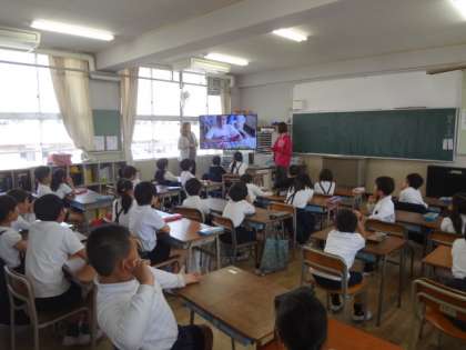 自己紹介は動画や写真を交え、子どもたちも興味深く聞いていました。