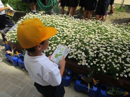 1年生がコンパクトな図鑑を持って校内の草花の観察をしました。