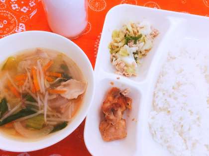 5月9日(水) 鶏肉のオイスターソース焼き 中華スープ ツナと野菜のごまいため 米飯 牛乳