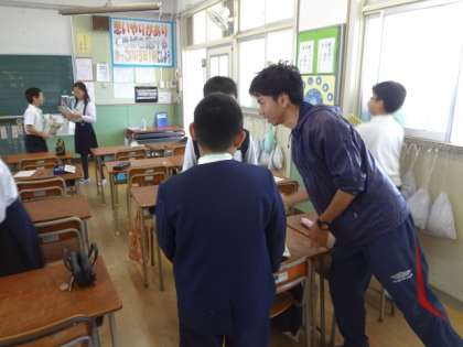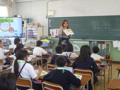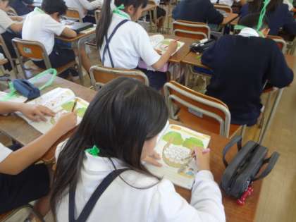 色を塗ったりんごの絵を見せて英語でインタビューし合いながら、何度も練習しました。