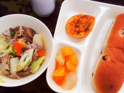今日の給食の変わりピザは、ギョーザの皮に、ツナ、コーン、ピーマン、ピザソース、チーズを混ぜ合わせた具をのせて焼き物機で焼いています。