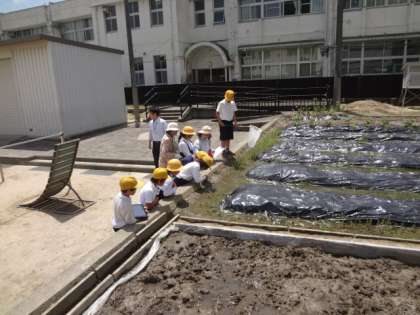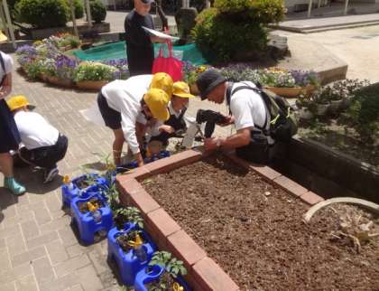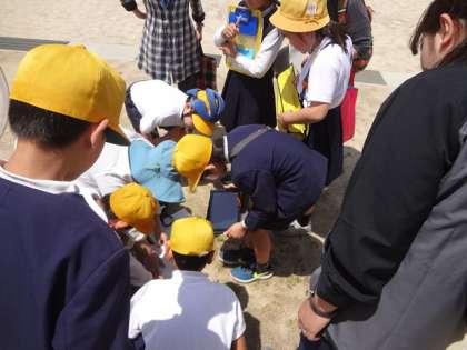 4班に分かれ、タブレットや虫網を持って、校内の昆虫や植物の観察をしました。