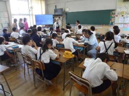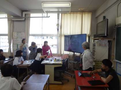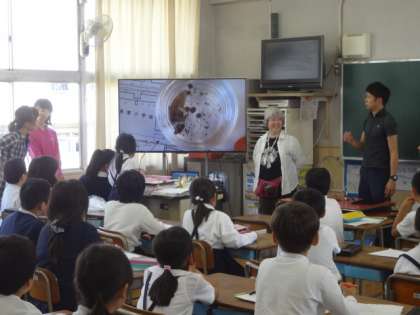 校内で採取した昆虫や植物を教室に持ち帰り、大型テレビに映して発表しあいました。