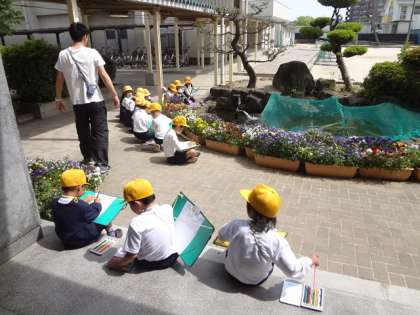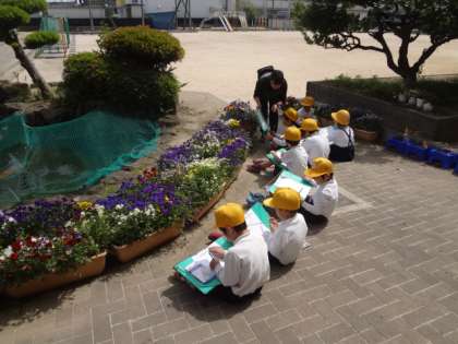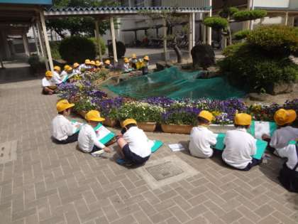1年生が池の周りのきれいなお花を観察して書いていました。