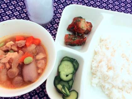 5月17日(木) 鶏肉とさといもの煮物 あっさりきゅうり ちくわのいそべあげ 米飯 牛乳