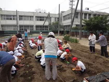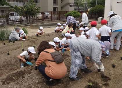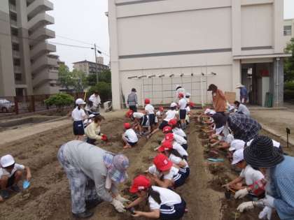 2年生が長原ガーデンで地域の方々とヒマワリとトウモロコシの苗を植えました。
