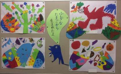 2年生の階段掲示は、「ふしぎなたまごからうまれたよ」です。