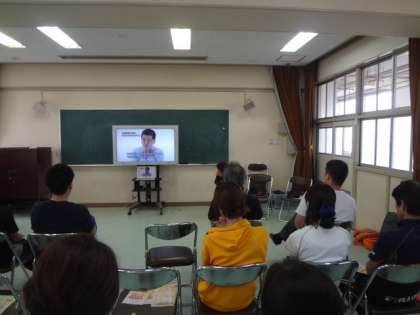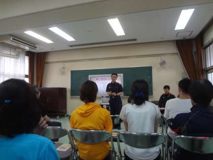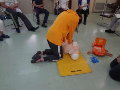 平野消防署の方がお越しくださり、従来の心肺蘇生法・AED使用法に加え、止血や気道異物除去法等についても教えてくださいました。