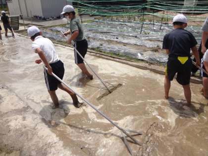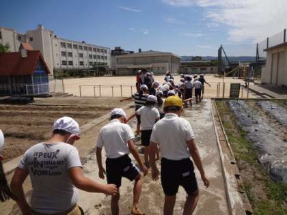 今日は、5年生が長原ガーデンの水田の代かきをしました。