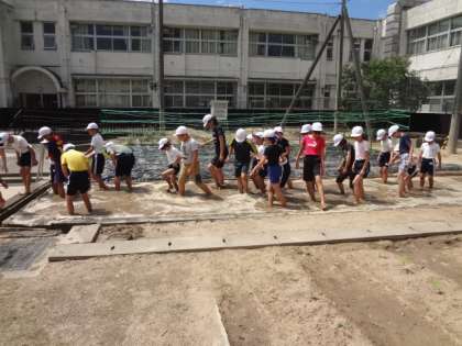 水田に裸足で足を踏み込んだ子どもたちは、日頃経験したことのない感触を楽しんでいました。その後、“トンボ”を使って地面をならしていきました。