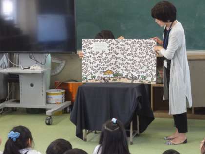 平野図書館からボランティアの方がお越しくださり、子どもたちに紙芝居や大型絵本を読んでくださいました。楽しそうな笑い声が響いていました。