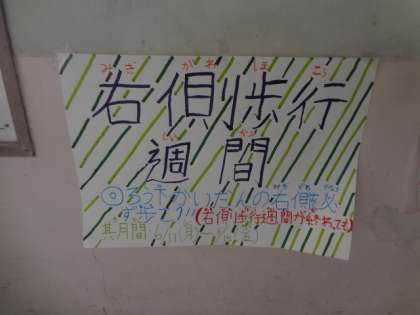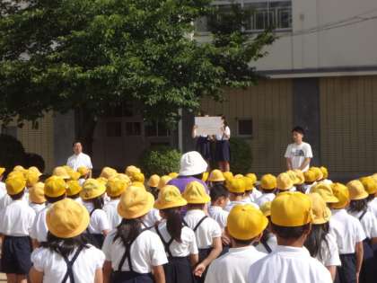 「今週は、右側歩行週間」です。」計画委員が児童朝会で呼びかけました。