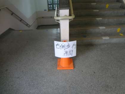 廊下にはポスターが張られ、階段には右側歩行を呼びかけるコーンが置かれています。