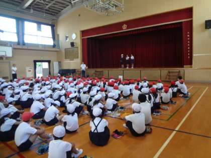 今日のスマイル集会は、バトミントンの羽運びリレーでした。