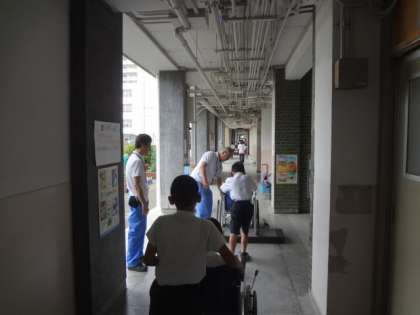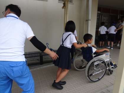 2時間目は、廊下に出て車椅子での介助の練習をしました。