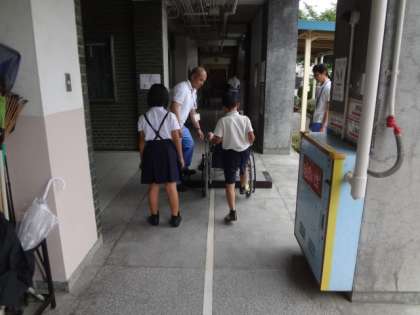 坂道を後ろ向きに下りたり、フットレバーを踏みながら前輪を段差の上にのせたりしながら、1階の長い廊下を進んでいきました。
