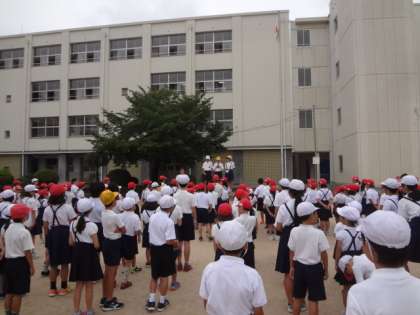 高学年が中心になって、低学年の子どもたちに声をかけながら集まって座っていました。