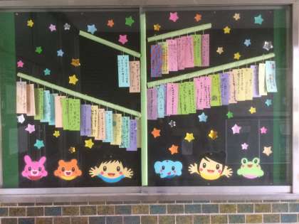 7月2日(月) 7月の玄関掲示は、6年生とわかたけ学級の子どもたちの合作のたなばた飾りです。