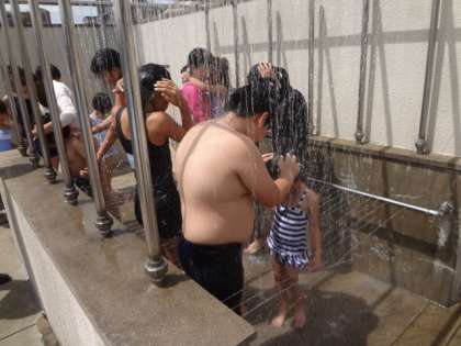 プールに移動した後、シャワーを浴びた園児たちはきゃっきゃっと大喜び。