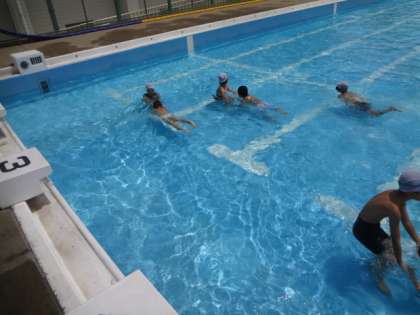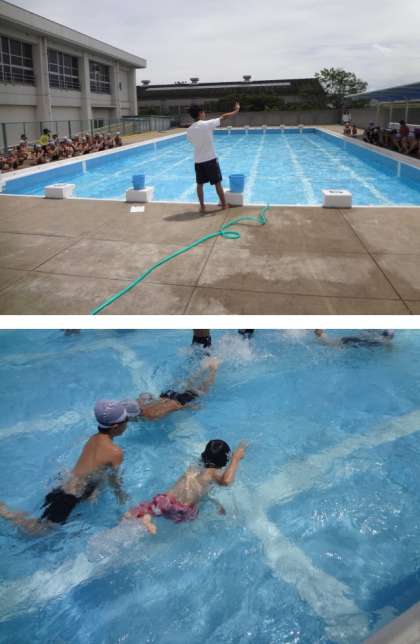 5年生のお兄さんやお姉さんに手を持ってもらって、アンパンマン泳ぎをしました。