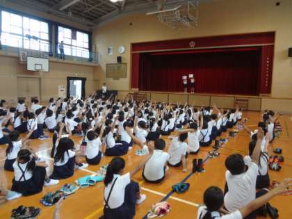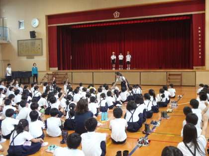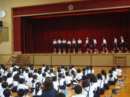 「記名の日週間」「あいさつ週間」「身だしなみ週間」等の取組みについて、劇やクイズを交えながら楽しく伝えていました。