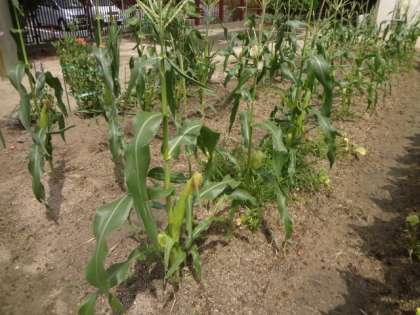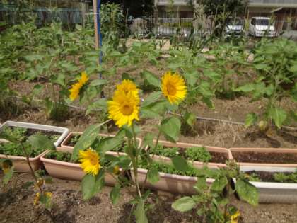 長原ガーデンに植えられている、ヒマワリやとうもろこしです。