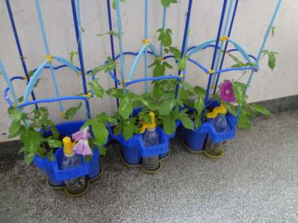 子どもたちが夏休みに家でアサガオを観察するため、懇談会後に保護者の方々に持って帰っていただくために準備しています。