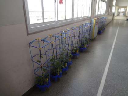 1年生が1学期に大切に育てたアサガオの植木鉢が、ろう下に並べられています。