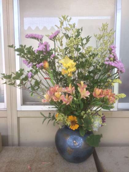 連日35度を超える暑さの中ですが、職員室前に活けてあるお花は、美しく咲き続けています。緑化推進委員の方が、こまめに手を入れてくださっているからです。