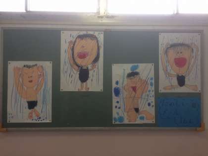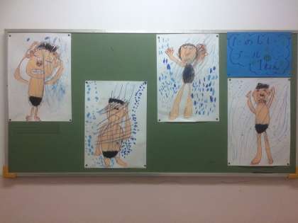 1年生の階段掲示は、図工の“たのしいプール”です。プール入水前にシャワーを浴びている様子が、いきいきと描かれています。