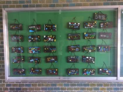 5年生が林間で作った焼き板工作が玄関掲示として飾られています。