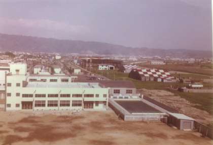 講堂とプールの向こう側に八尾空港の様子が見えています。