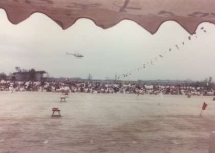 運動会の写真を見ると、ヘリコプターが高度低く跳んでいるのが見えます。
