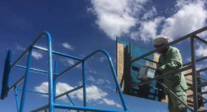 管理作業員さんが、運動場のバスケットゴールを塗装しました。