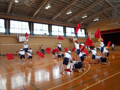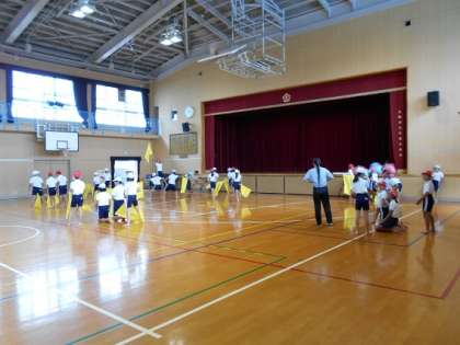 フラッグが周りの児童に当たらない様に、交代で練習をしていました。