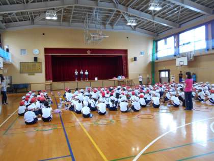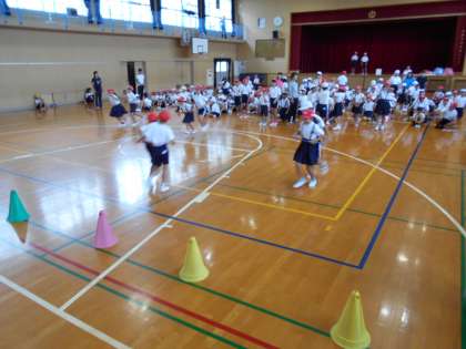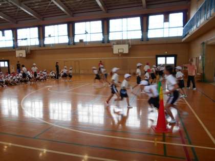 フラフープの中に二人が入って、低学年の児童が運転手になってコーンをまわりました。