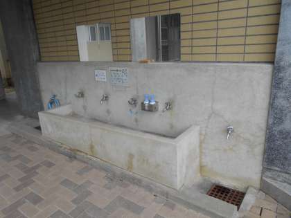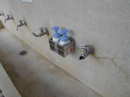 管理作業員さんが給食のスプーンかごの廃棄品を利用して、手洗い場に石けんポンプ置場を作ってくれました。とても便利で、みんな喜んでいます。