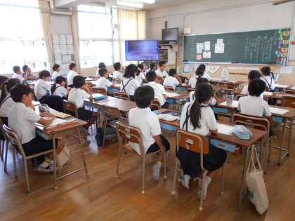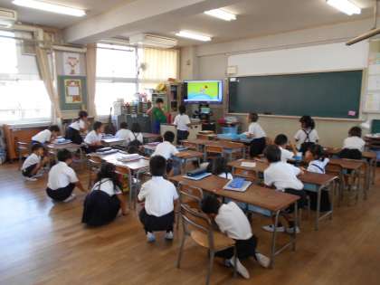 4年生は耳を澄ませて、スピーカーから流れてくる英語を聞き取ろうとしています。