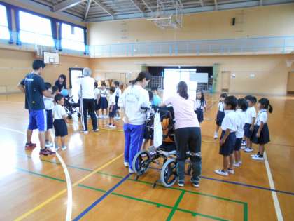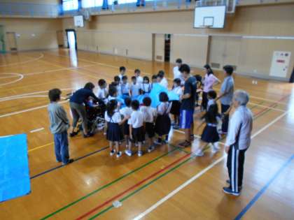 長原小学校講堂で、平野支援学校の児童と交流活動をしました。