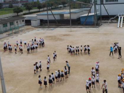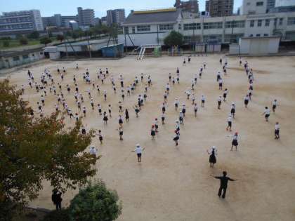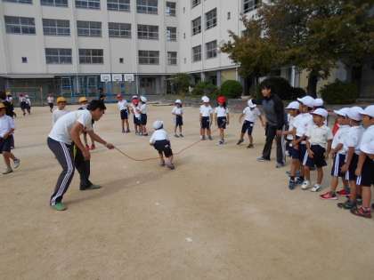 曇り空から太陽ものぞくお天気の中、なわとびタイムが行われました。
