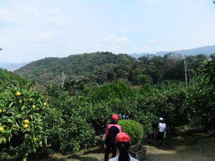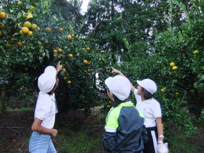 おいしいみかんの見分け方を教えてもらった子どもたちは、よく観察しながら慎重に実をもぎ取っていました。