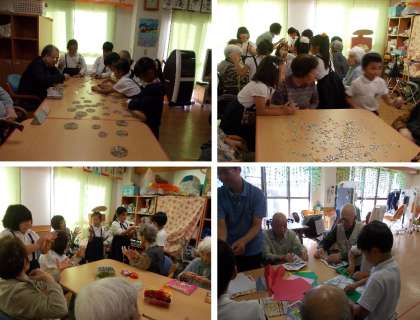 “かわなべ健康倶楽部(くらぶ)”を訪問し、折り紙・あやとり・おはじき・めんこなどの昔遊びをしたあと、運動会で踊ったダンスを披露しました。