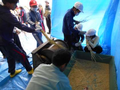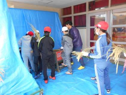 急遽体育館前の屋根の下に“足踏み脱穀機”を置いて脱穀を行いました。
