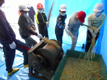 今日は、5年生が育ててきた稲の脱穀をしました。