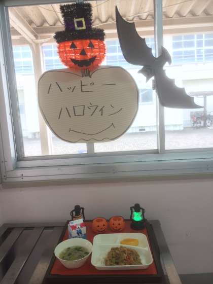 給食調理員さんが給食室に“ハローウィーン”の飾りをしました。