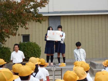 図書委員会からは、11月1日から始まる“読書月間”についての呼びかけがありました。図書館開放の時間や、“スタンプカード”や“図書館前のクイズ”などに参加すると“もう一冊借りられます券”がもらえることなどについて伝えていました。